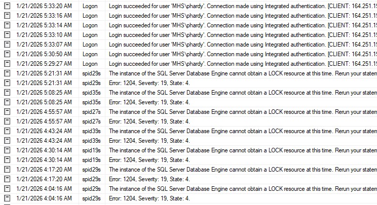 Stumped. I’m seeing Error 1204 severity 19 state 4 every 13 to 15 minutes all day with different system spids. Even when there are no users logged on and no jobs running in the background. Also strange that when a user does connect it has multiple connections logged. Here is the activity log when the first user logged on for the morning. That user connects through MSAccess ODBC.
